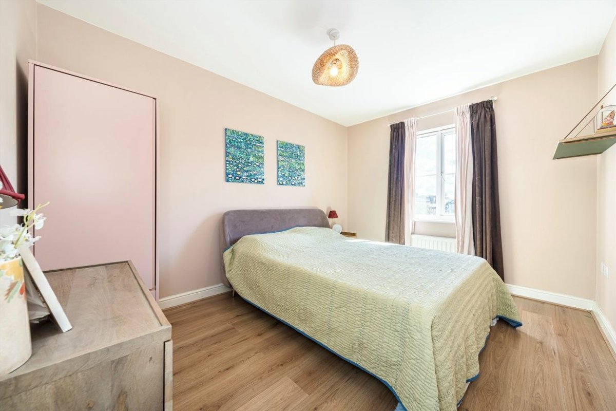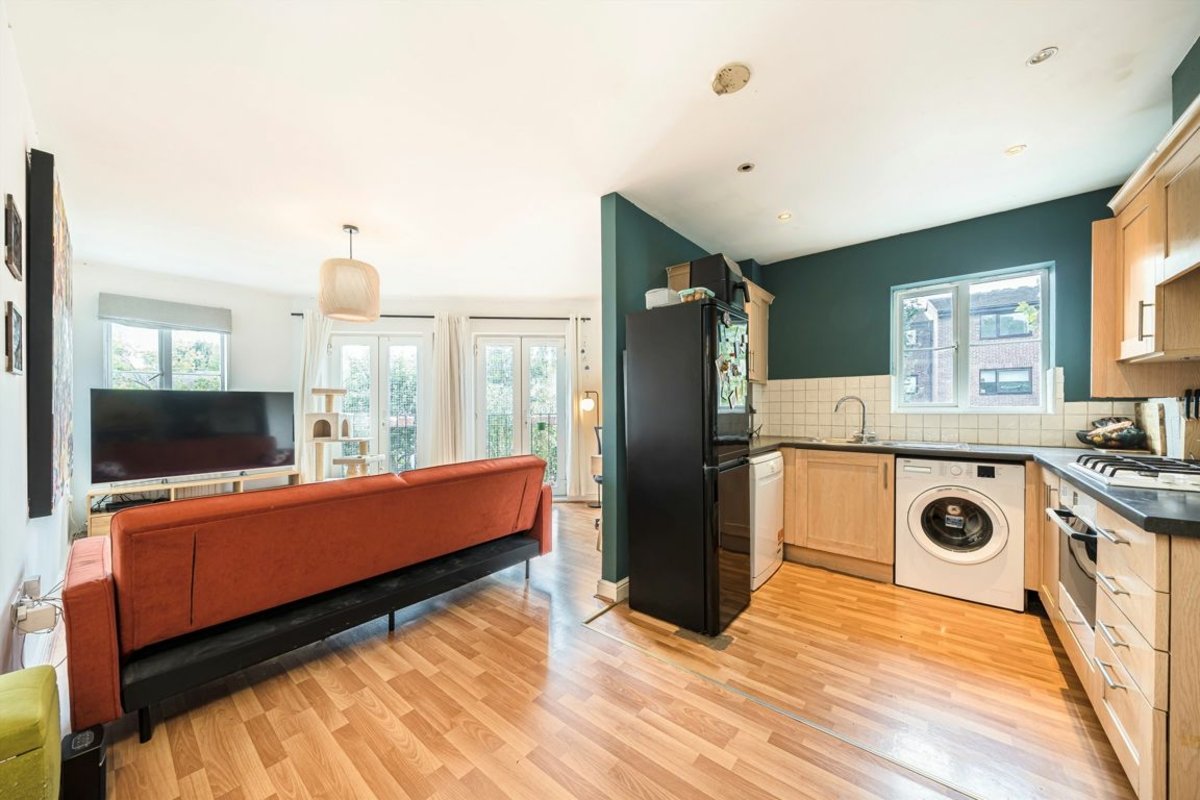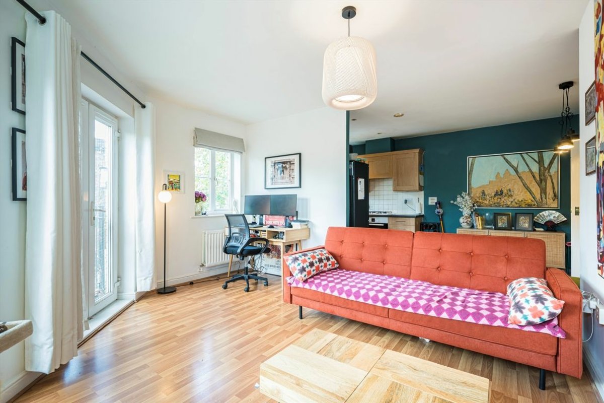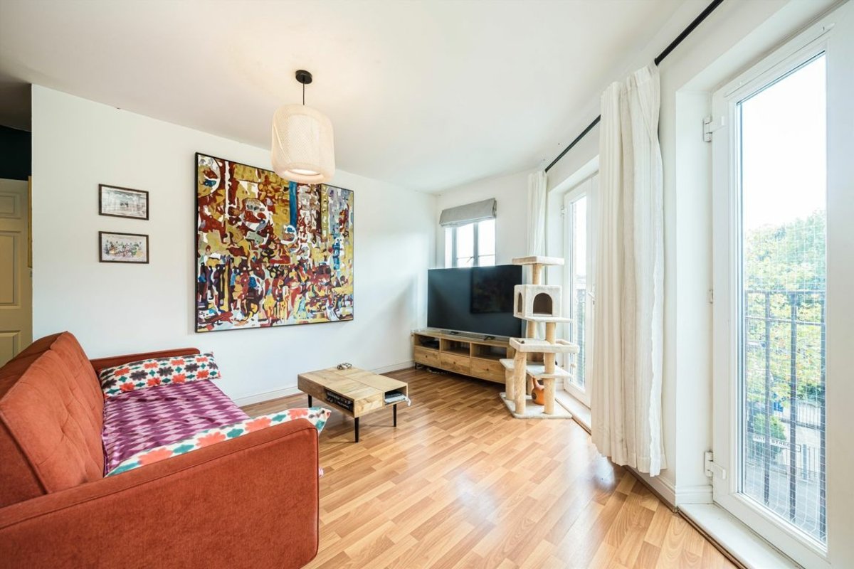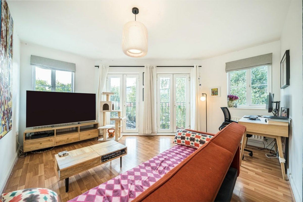 The accommodation comprises two generously sized double bedrooms, a stylish modern bathroom, a bright and expansive reception room with twin Juliet balconies, and a well-designed semi open-plan kitchen. Additional perks include secure cycle storage for residents and access to a shared outdoor area.