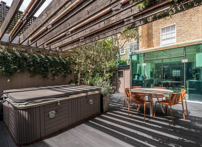 An exceptional six-bedroom residence featuring a beautifully landscaped private garden complete with a hot tub and sauna. All six bedrooms are situated on the upper floor, offering an ideal layout for family living. This impressive home combines generous proportions with modern amenities, making it a perfect choice for comfortable and luxurious family life.