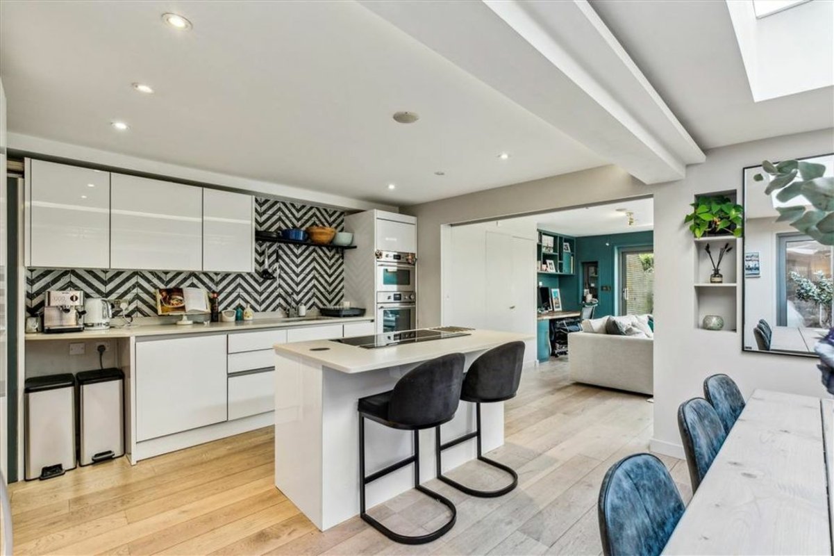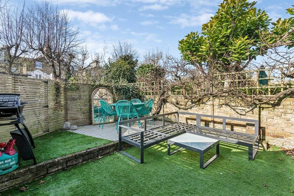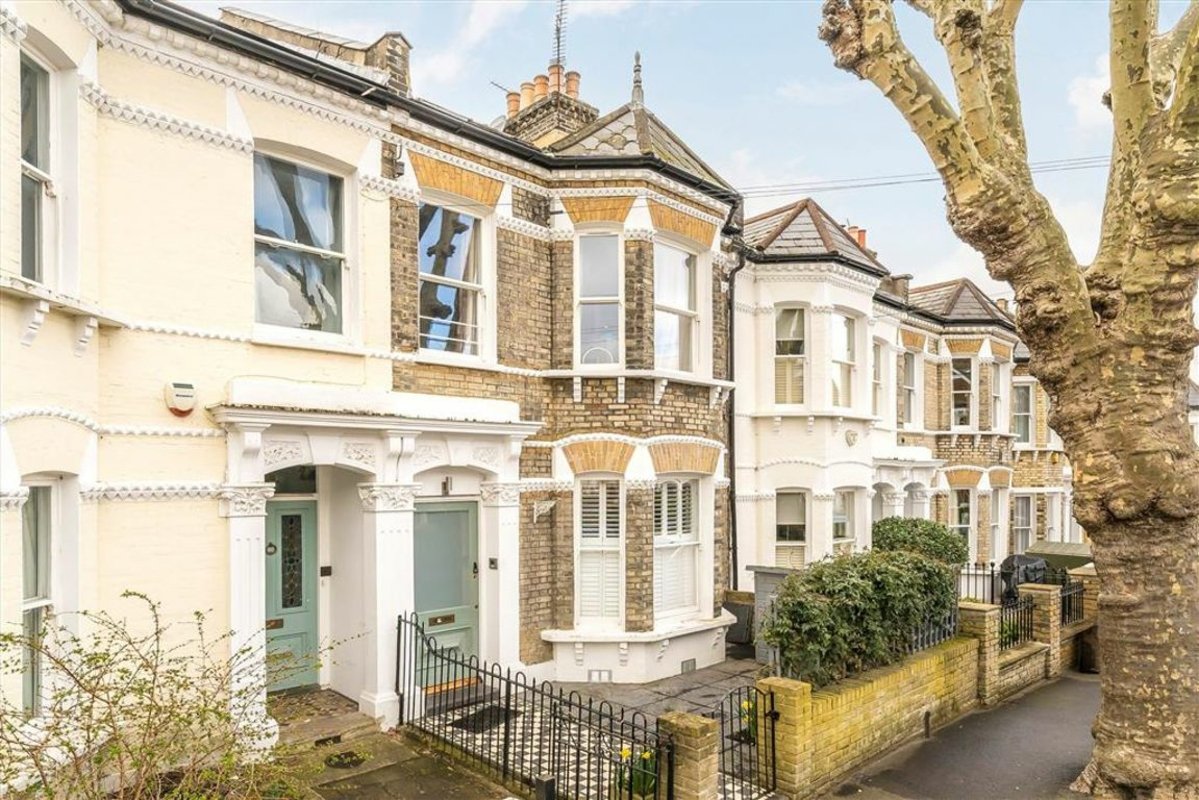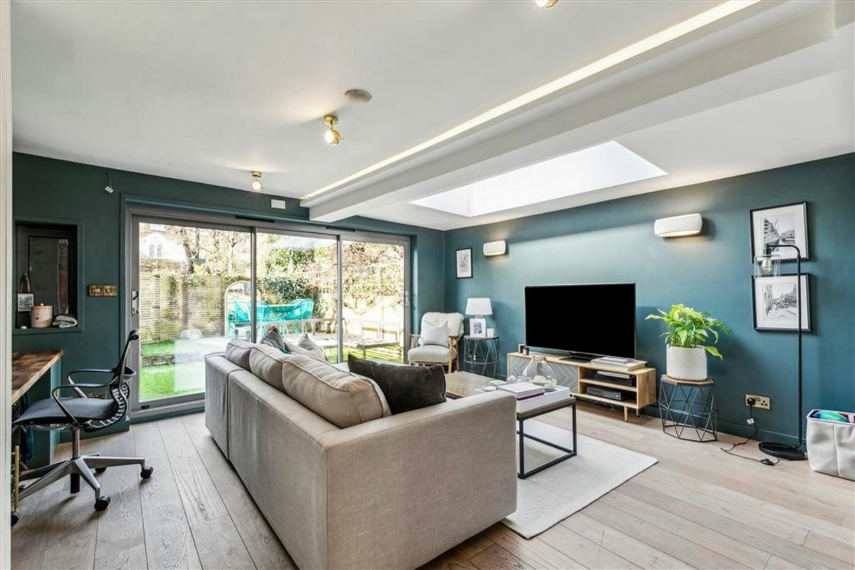 Arranged to include a semi open-plan reception room with a comfortable seating area, fitted shelving and desk, an adjoining contemporary kitchen featuring a range of integrated appliances, a central island and ample room for a large dining table. The two spaces can be separated by partition pocket doors and also include a utility cupboard and toilet. Large-format sliding doors frame a private, low-maintenance garden. Moving towards the front of the property, there are two spacious double bedrooms, both with bespoke fitted wardrobes and intricate ceiling plasterwork, and a family bathroom. Offered to the market with a share of freehold.