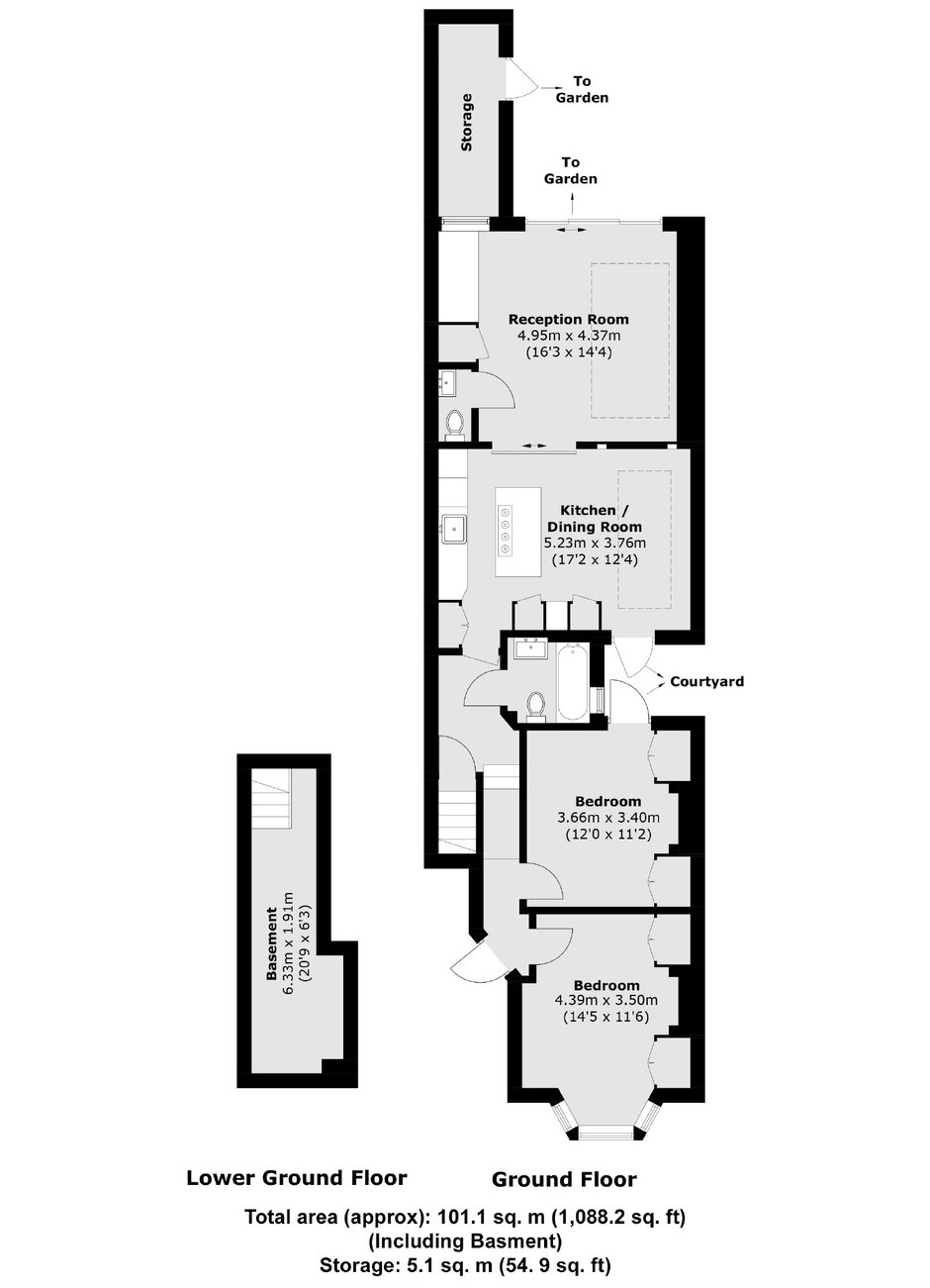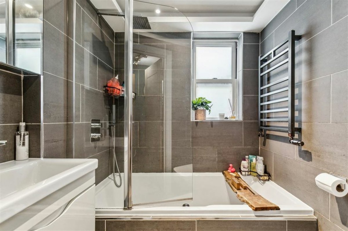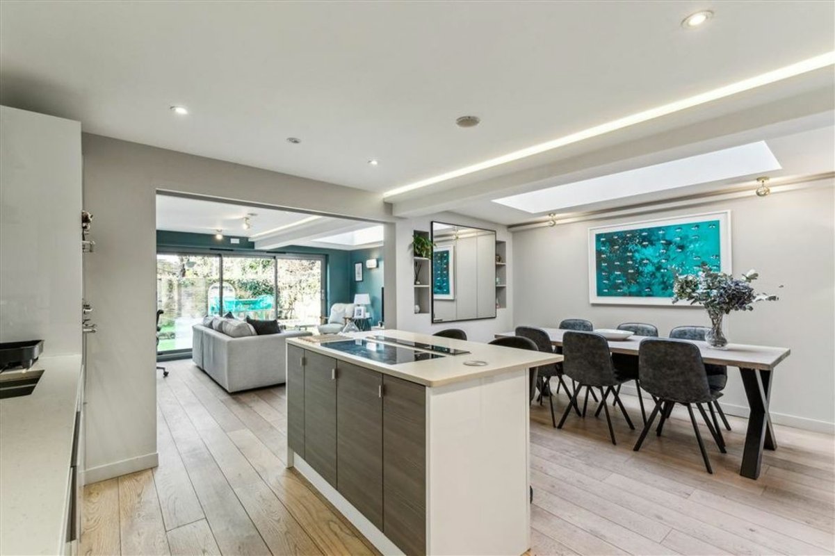 Arranged to include a semi open-plan reception room with a comfortable seating area, fitted shelving and desk, an adjoining contemporary kitchen featuring a range of integrated appliances, a central island and ample room for a large dining table. The two spaces can be separated by partition pocket doors and also include a utility cupboard and toilet. Large-format sliding doors frame a private, low-maintenance garden. Moving towards the front of the property, there are two spacious double bedrooms, both with bespoke fitted wardrobes and intricate ceiling plasterwork, and a family bathroom. Offered to the market with a share of freehold.