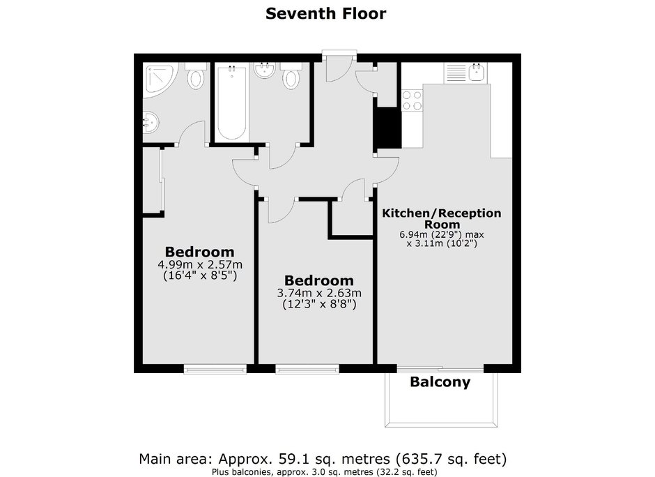 INVESTORS ONLY A two bedroom apartment situated on the seventh floor with just under 650 sq.ft of internal living space. The flat has two bathrooms (one en suite) and a private balcony.