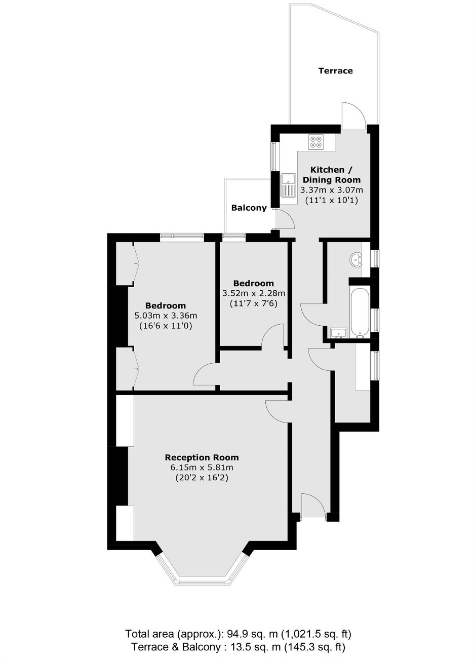 A ground floor flat set in a period conversion. This property features a large reception room with a bay window, a separate kitchen, two double bedrooms, one of which includes built-in storage, a balcony and a terrace.
