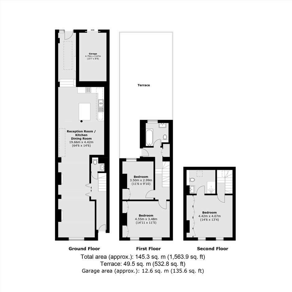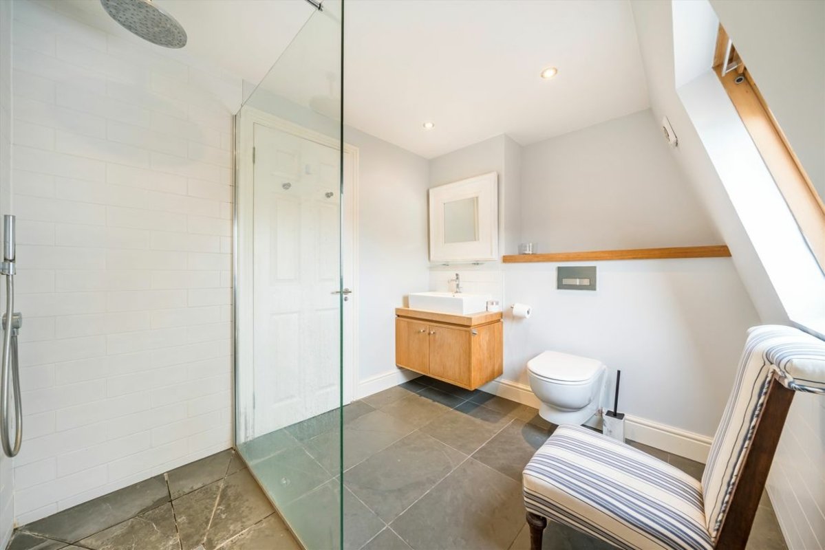 The first floor comprises two generously sized bedrooms with built and wardrobes and a contemporary family bathroom. From this level, there is access to a secluded roof terrace exceeding 500 sq ft, offering a wonderful private outdoor retreat.