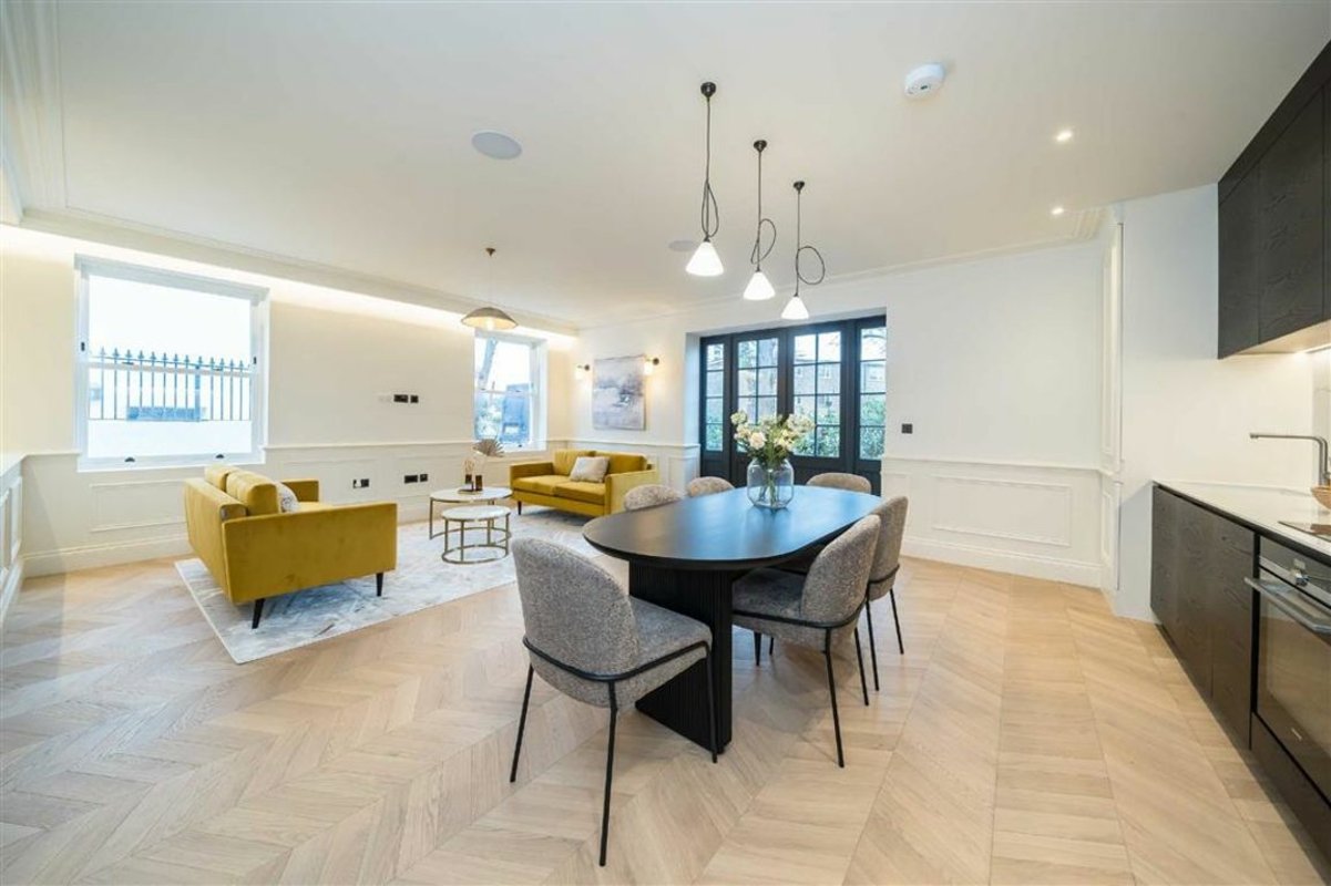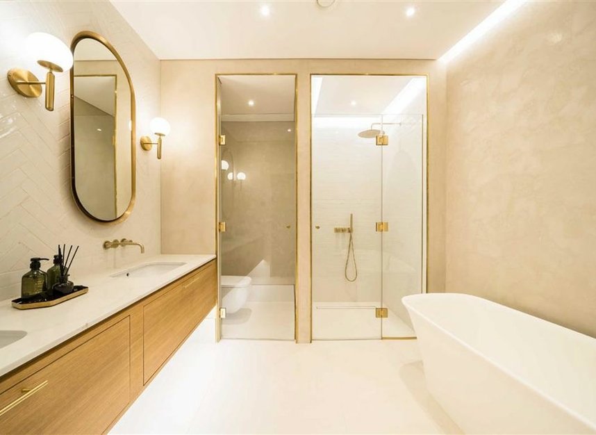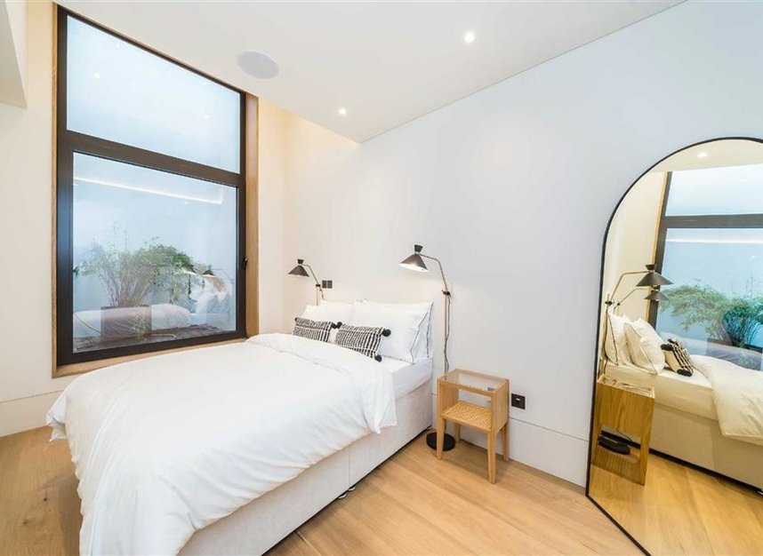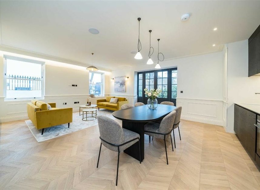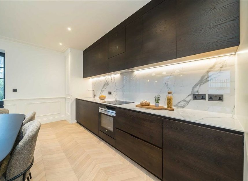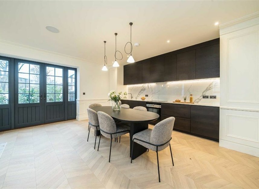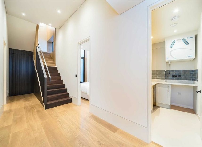 Arranged over three floors the property extends to an impressive 2,149 sq.ft and has exceptional ceiling height throughout, the ground floor comprises a wide hallway with a guest cloakroom and an inspiring open plan reception room floored with oak and a bespoke kitchen featuring a range of integrated appliances.