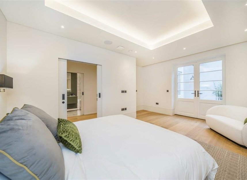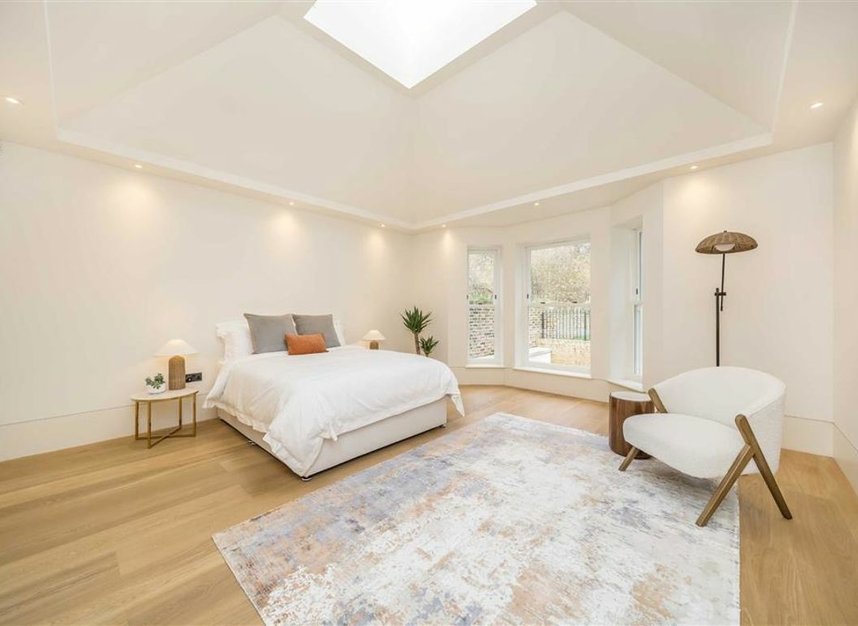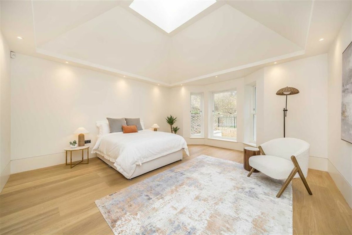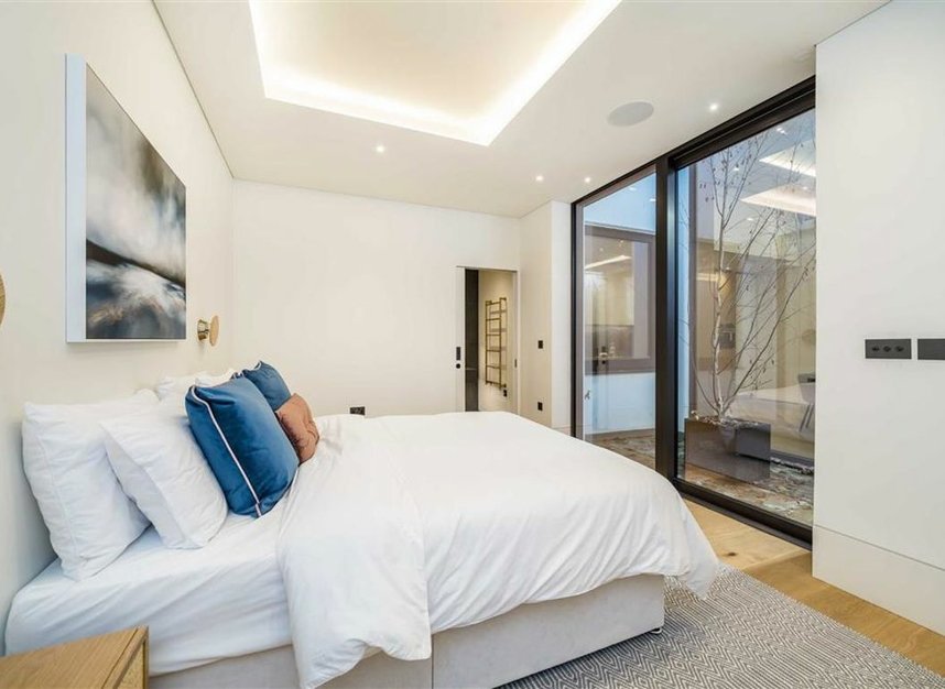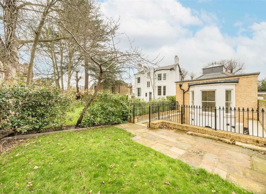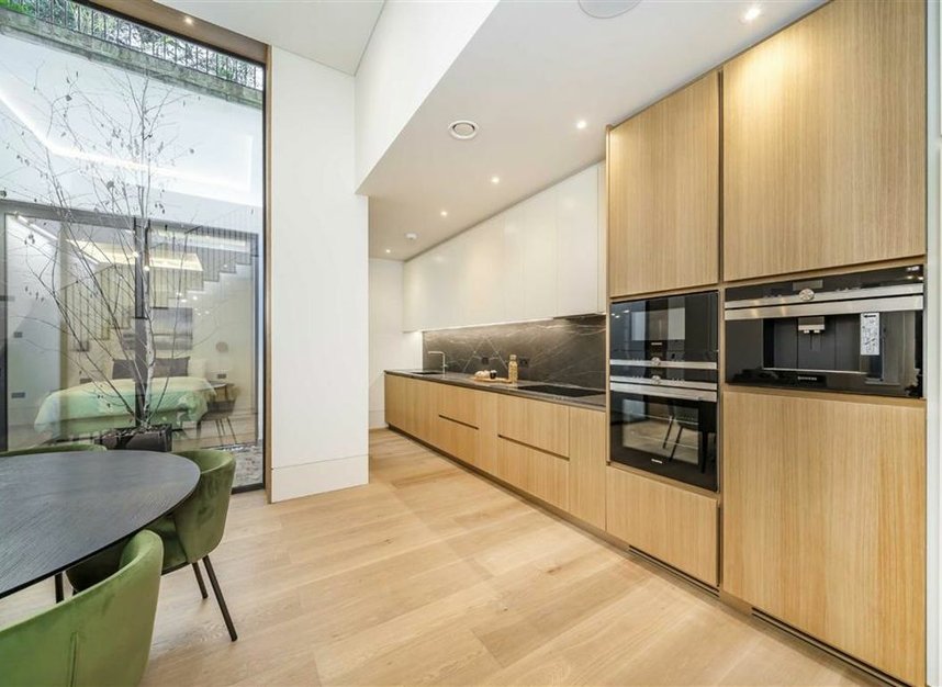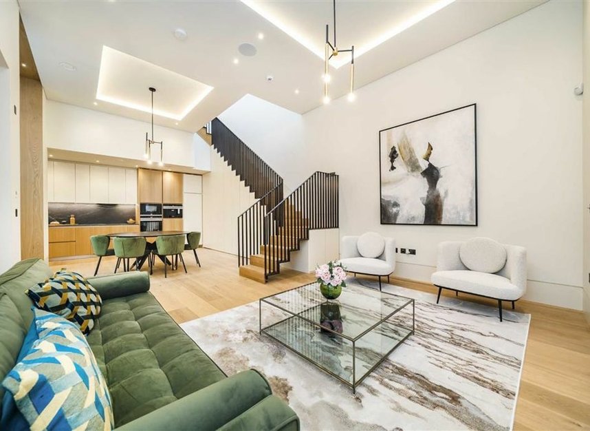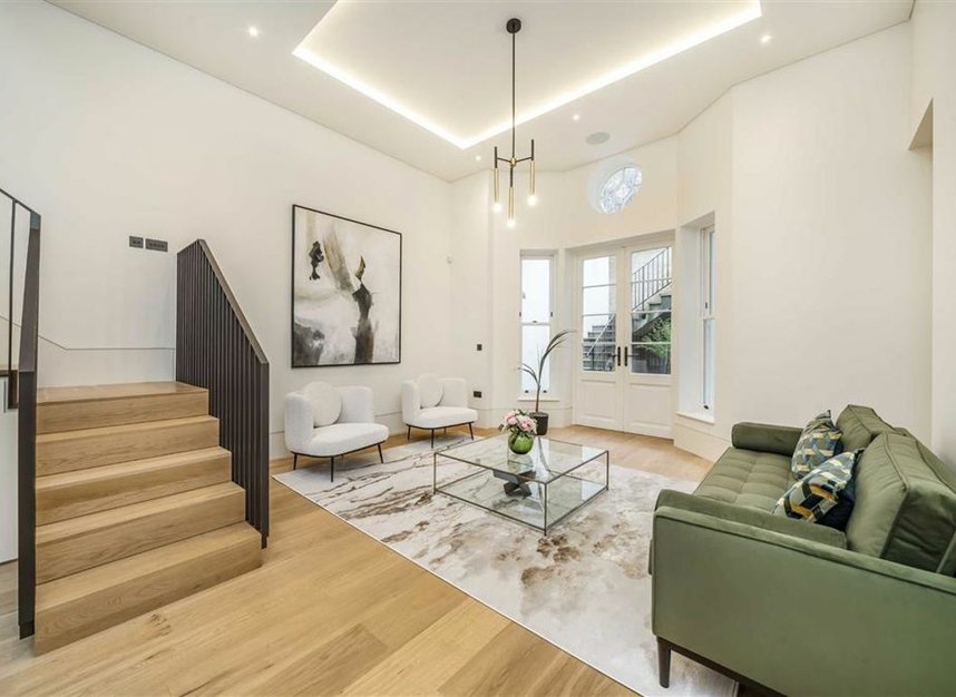 The accommodation has been artfully arranged over two floors to create beautifully balanced living and entertaining space with exceptionally high ceilings throughout. A vast open-plan reception room is situated on the lower level and includes a bespoke kitchen which features a range of integrated appliances and ample room to dine. A floor-to-ceiling window looks inwardly over a large lightwell whilst French doors open onto the lower terrace which leads to the garden. Over the remainder of this, and the upper floor there are three double bedrooms, three bathrooms and a utility area. The principal bedroom has a walk-through dressing room and en suite facilities. Further benefits include an intercom system, security cameras, an air source heat pump and exceptional energy efficiency (35 % better than building regulations requirements).