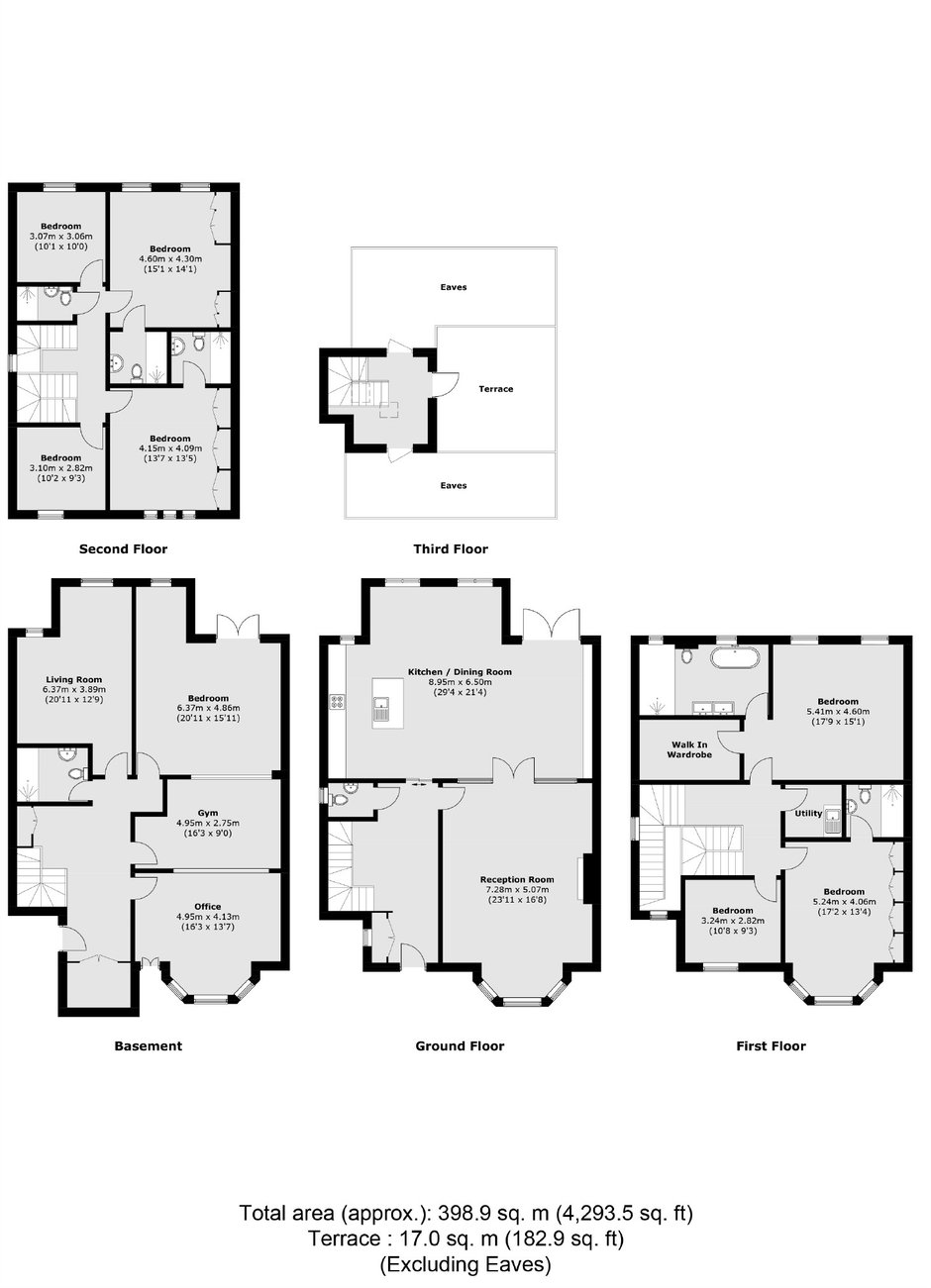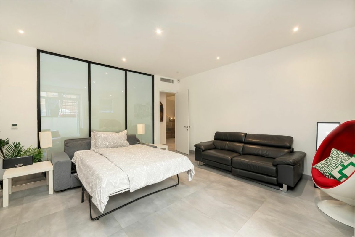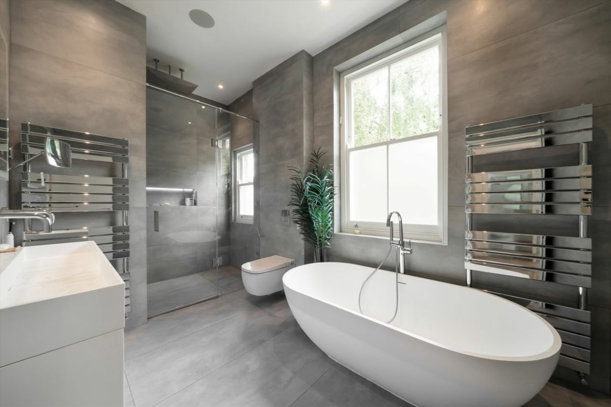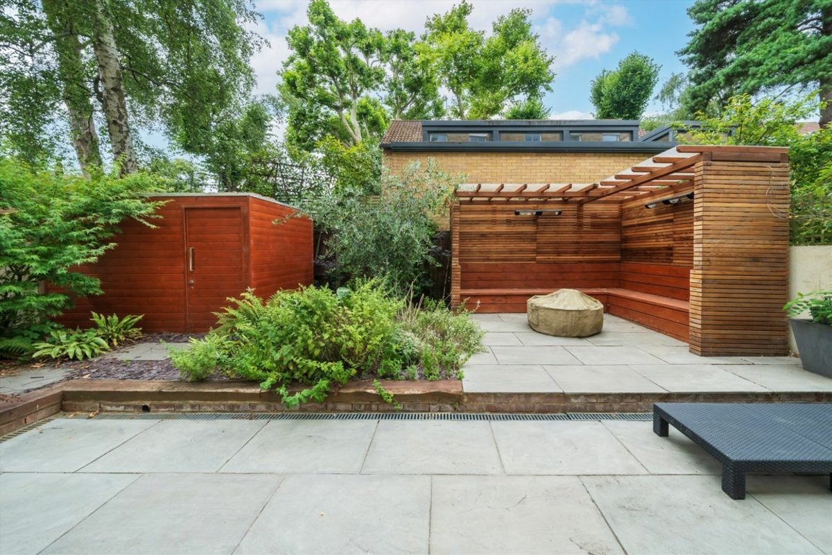 On the first floor, the principal suite provides a serene retreat, complemented by four further generously sized bedrooms and three luxurious bathrooms on the second floor. A private roof terrace crowns the home, offering a tranquil outdoor escape.