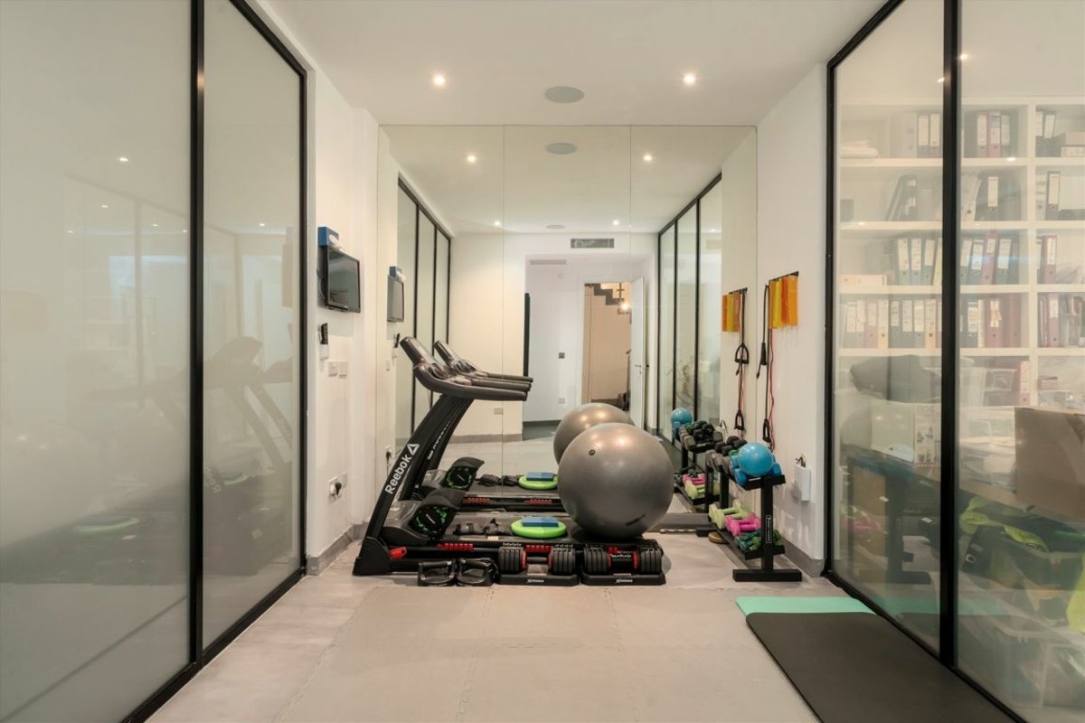 The lower ground level features a well-equipped gym, a private office, a guest bedroom with an accompanying bathroom, and an additional reception room, offering exceptional flexibility for modern lifestyles.